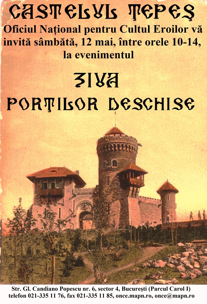 Oficiul Național pentru Cultul Eroilor (ONCE) organizează Ziua Porților Deschise, sâmbătă, 12 mai, între orele 10.00 și 14.00, la Castelul Țepeș din Parcul Carol I.