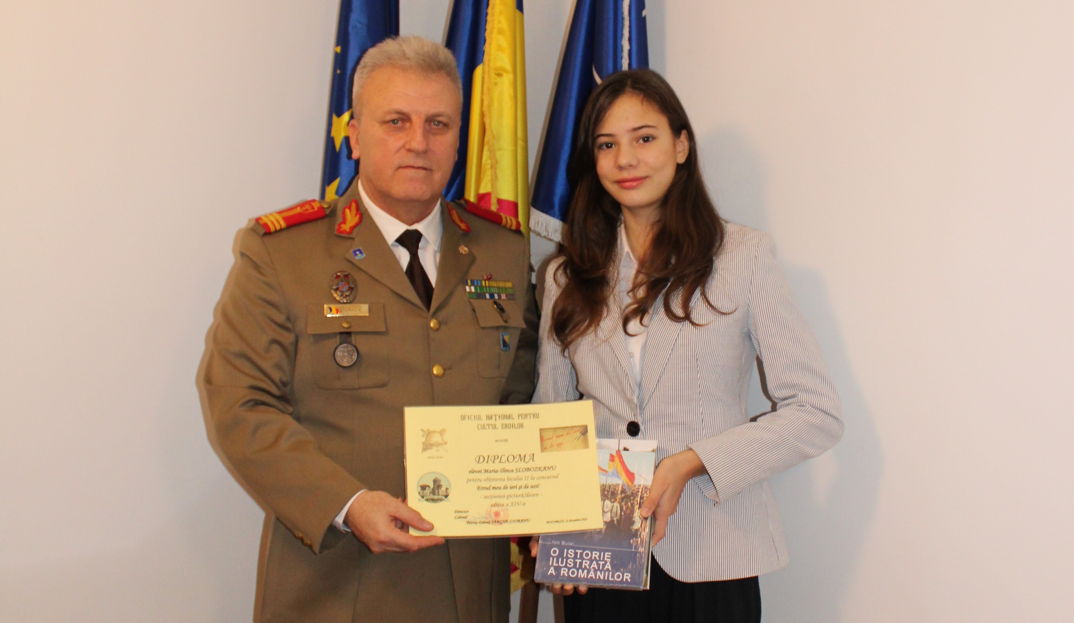 Astfel, domnul colonel Petruț-Dănuț Sârghe-Ciobanu a înmânat câștigătoarei locului al II-lea al acestui concurs, de data aceasta, secțiunea desen, elevei Slobozeanu Maria-Ilinca, diploma și premiul. Concurenta este eleva Școlii Gimnaziale nr. 279 din București și a venit însoțită de domnul profesor Radu Titus, care i-a susținut hotărârea de a participa.