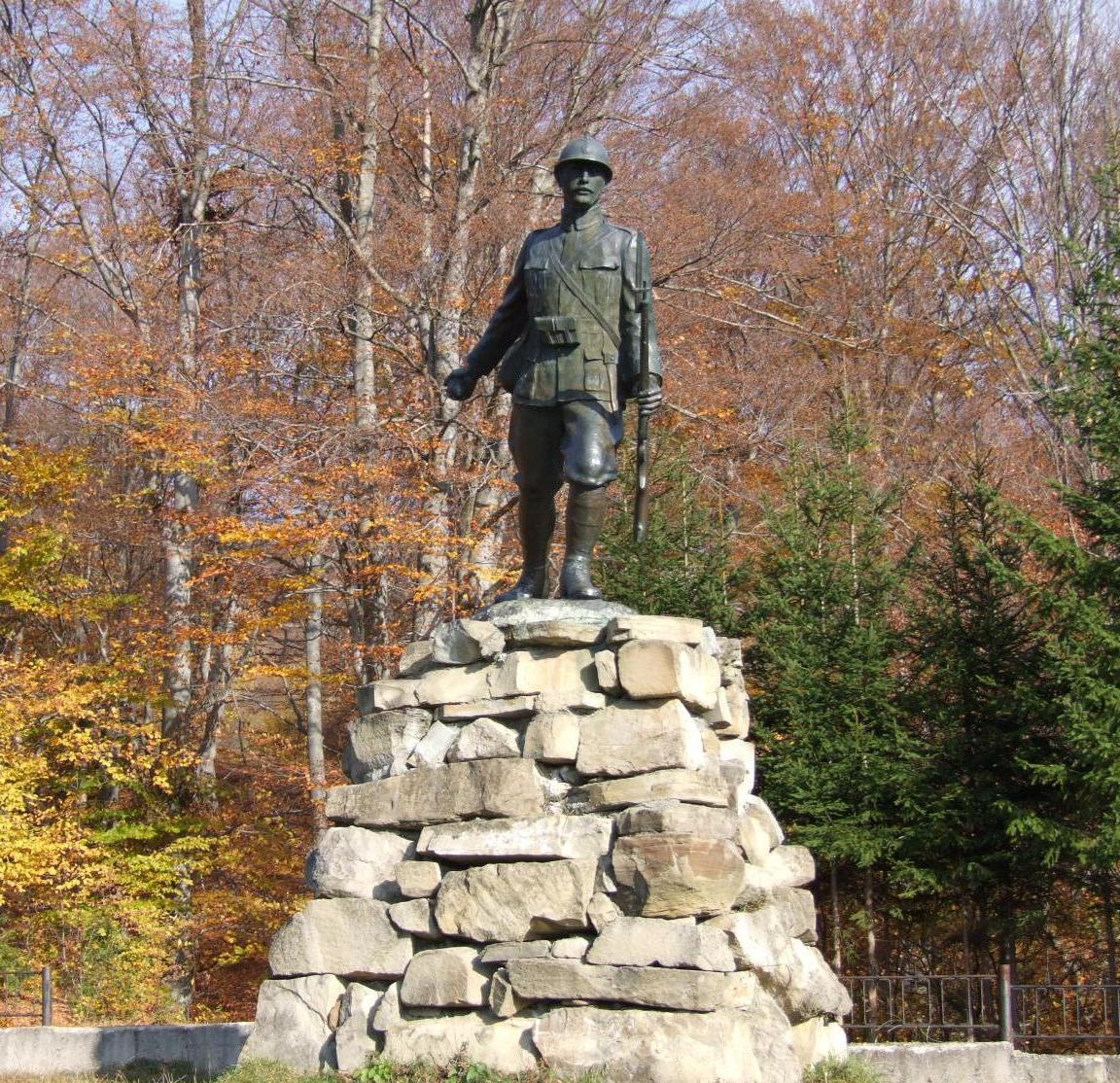 Dezvelit în anul 1938, în cadrul unei impresionante ceremonii, în prezenţa mai multor supravieţuitori ai luptelor din anul 1916, monumentul este alcătuit dintr-un soclu masiv din blocuri de piatră, de forma unui trunchi de piramidă, deasupra căruia se înalţă o statuie din bronz, reprezentând un ostaş român în poziţie de atac, ţinând puşca în mâna stângă şi o grenadă în cea dreaptă.