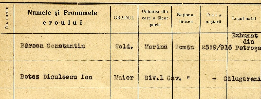 După stabilirea identității eroului s-au întocmit actele de stare civilă, urmând înhumarea acestuia, la 4 octombrie 1916, oficiindu-se o slujbă religioasă la care au asistat ofițerii din garnizoana locală.