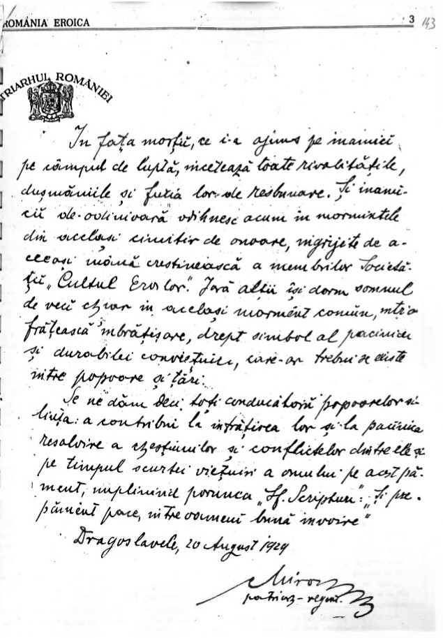 Înțeleagă oricine cât de milostiv a fost Dumnezeu cu noi, când ne-a dat atâția eroi, cari au înscris cu sângele lor pagini așa de glorioase în istoria marelui răsboiu, pentru întregirea neamului.